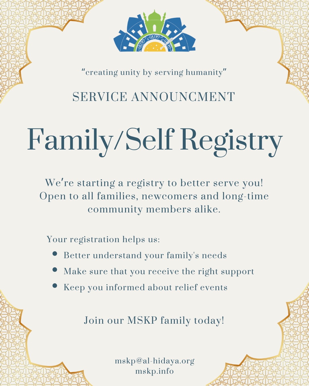 We are just like you determined to make a change in the world. MSKP puts faith to practice by providing food to the homeless and helping those in need. We engage our youth in service and strive to fulfill our duty to our neighbors. We believe we are ONE in essence, irrespective of our colors and beliefs and share the need to serve humanity through uniting with our families, friends, neighbors, and community members.